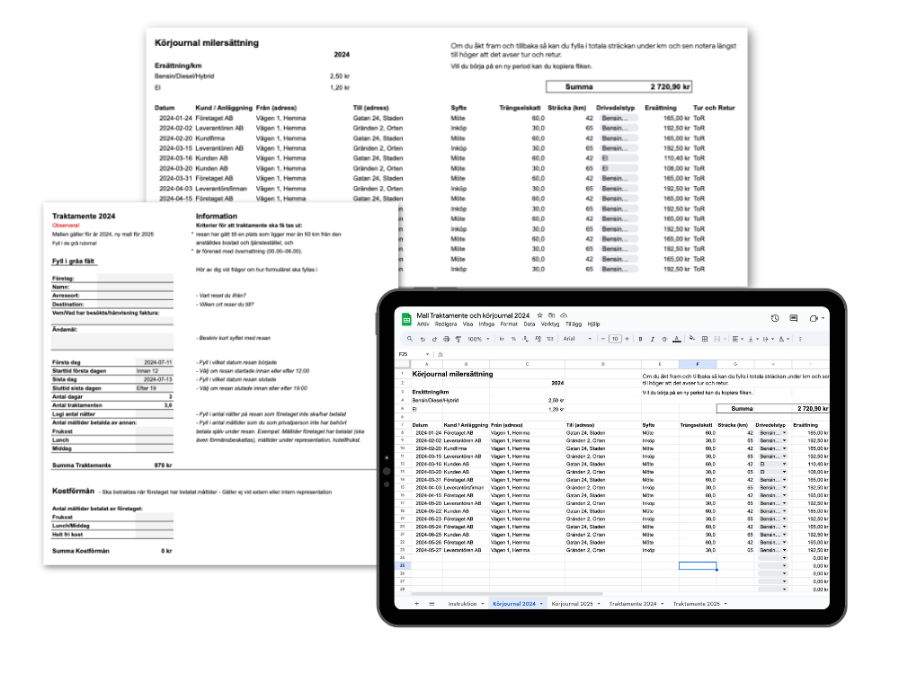 I den här mallen får du hjälp att räkna ut bilersättning vid resor med privat bil i tjänsten samt traktamente vid tjänsteresor med övernattning. Här får du en färdig mall så att du slipper räkna, hålla reda på belopp och försöka läsa dig till Skatteverkets regler!